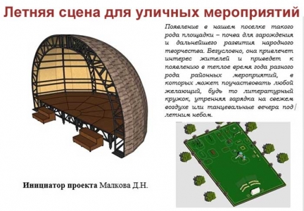 Жители решили принять участие в конкурсе проектов инициативного бюджетирования. Инициатором проекта «Летняя сцена для уличных мероприятий» выступила Диана Николаевна Малкова.