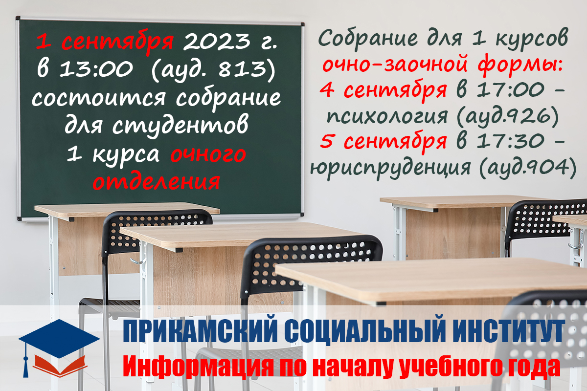1 сентября 2023 года в 13:00 в аудитории 813 состоится собрание для студентов 1 курса очного отделения юридического факультета и факультета психологии и управления.