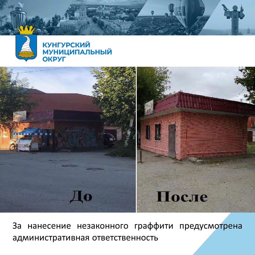 Согласно Правилам благоустройства территории Кунгурского муниципального округа Пермского края, утвержденным решением Думы Кунгурского муниципального округа Пермского края от 15.12.2022 № 635 на территории Кунгурского муниципального округа Пермского края запрещается несанкционированное нанесение на ограждения, фасады, стены зданий надписей, в том числе содержащих пропаганду или рекламу наркотических средств и психотропных веществ, графических изображений.