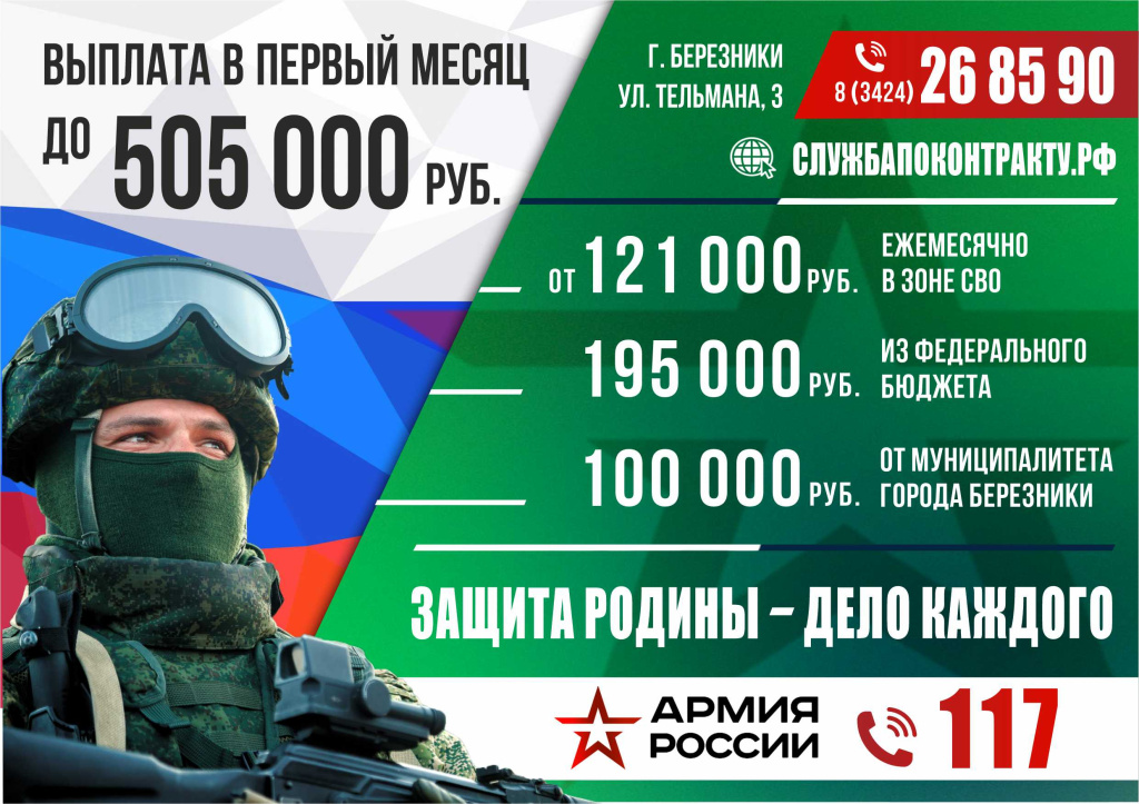 В общей сложности солдат-контрактник из Березников получит более полумиллиона рублей в первый месяц службы. Если вы хотите внести свой вклад в нашу победу – обращайтесь в стационарный пункт, он располагается у остановки «Торговая площадь». График работы – ежедневно с 14:00 до 20:00.