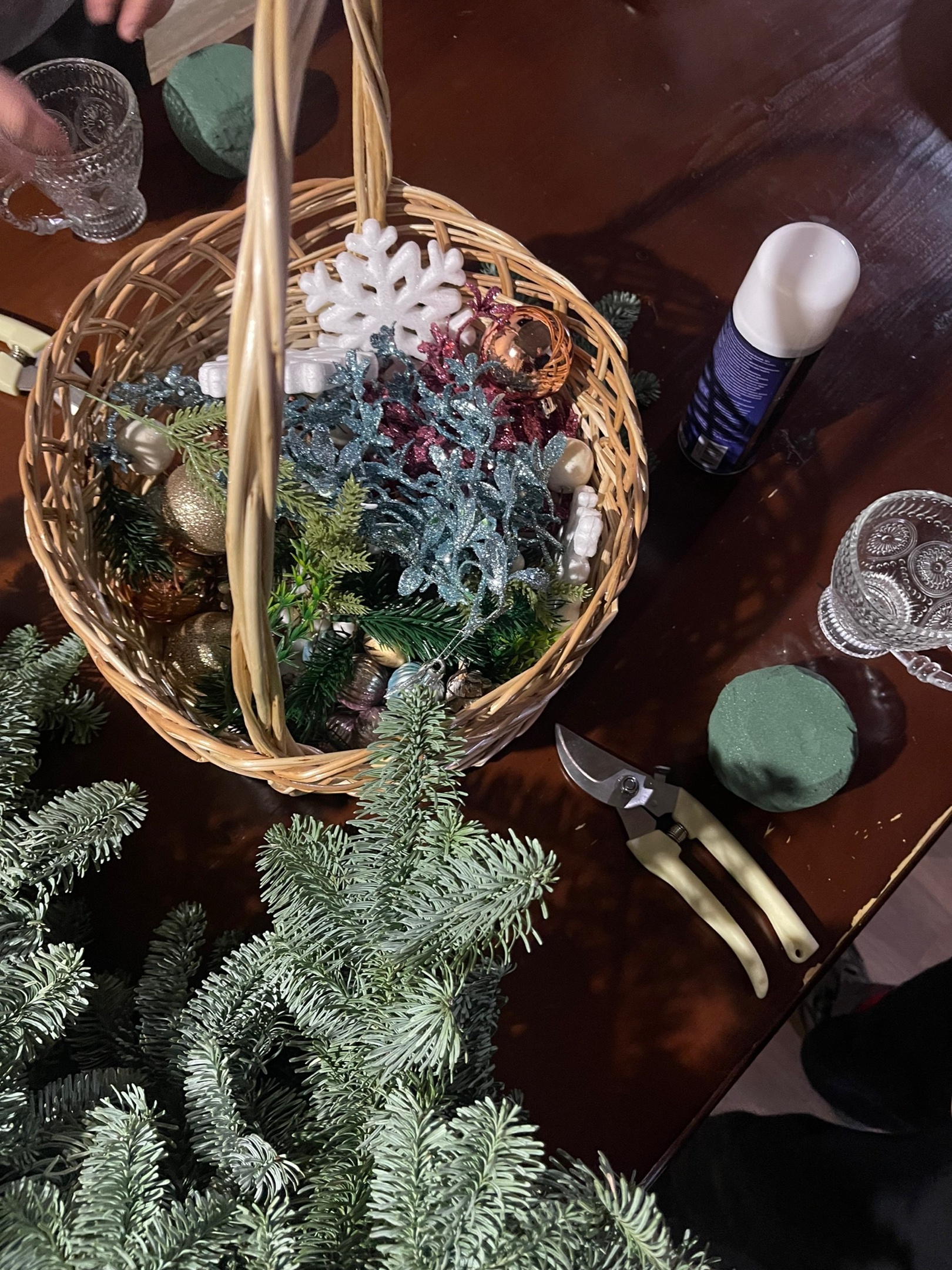 Всего за один час под присмотром наставницы ребята научились работать с секатором, флористической губкой, живым материалом, узнали про основы композиции и сделали к Новому году свои индивидуальные композиции.