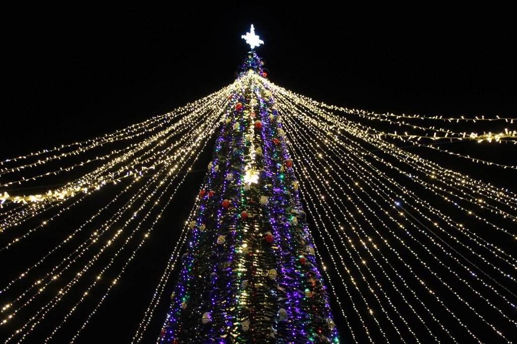Украшают ёлку 500 разноцветных – синих, золотых и красных – шаров. В хвою вплетена светодиодная нить, на верхушке установлена восьмиконечная звезда. А над ёлкой – огромный купол-шатёр из гирлянд.