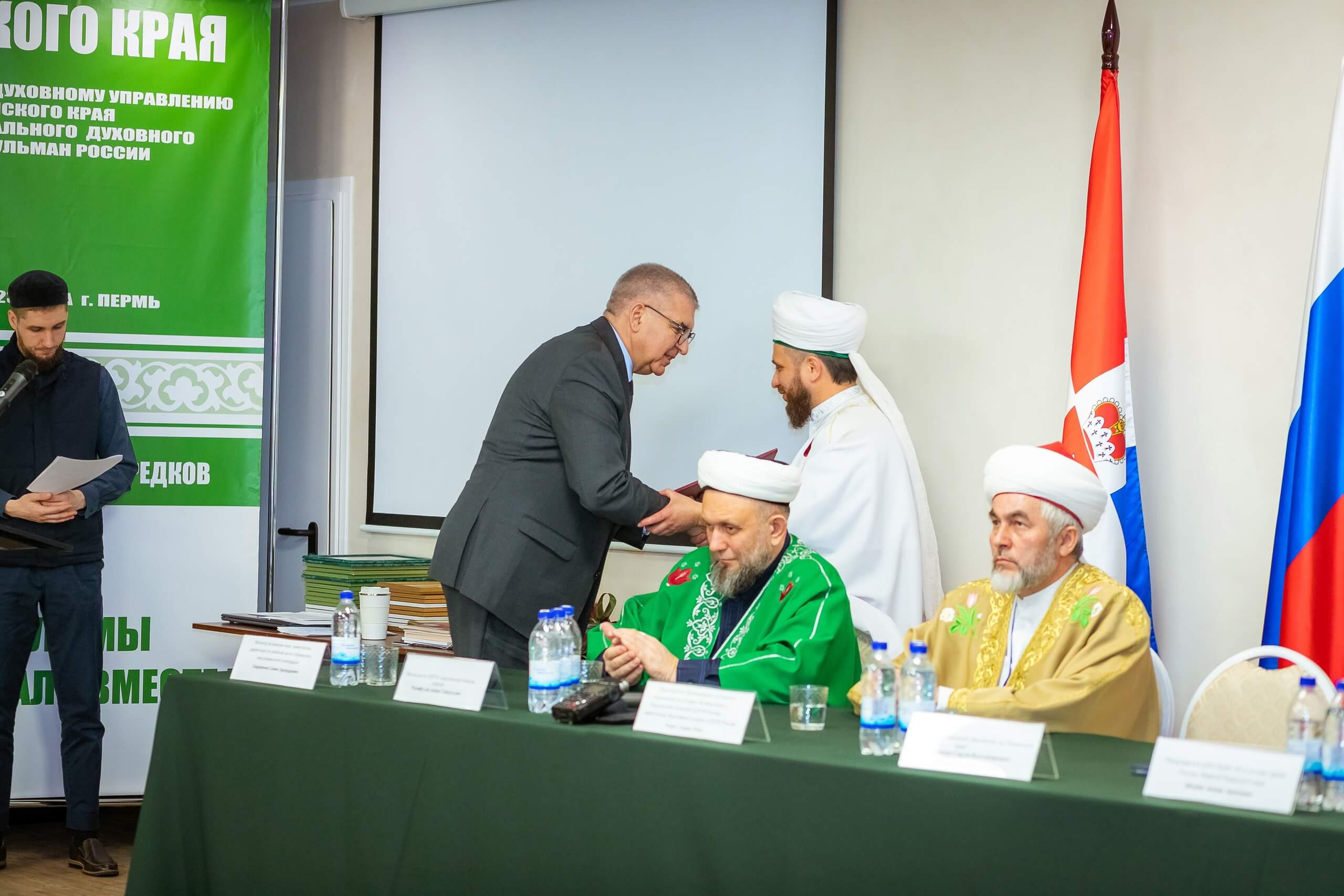 Ведущий предоставил слово Главному федеральному инспектору по Пермскому краю Сергею Половникову: «Уважаемый Анвар хазрат, представители общин, диаспор, гости, поздравляю всех со знаменательным событием в жизни краевой уммы – 30-летием Пермского муфтията. Все мы живём дружно и мирно в многонациональной, многоконфессиональной стране. Мы нацелены на высшие идеалы и ценности. Россия – пример, как все могут жить в мире и согласии. Сейчас идёт СВО по защите наших соотечественников на исторических рубежах России, по демилитаризации и денацификации кровавого режима Украины. Мы должны вместе противостоять общим угрозам, быть едиными. И в этом большую роль играет РДУМ ПК, краевая мусульманская община. Всем желаю здоровья, успехов в духовной деятельности, в поддержке наших воинов и их семей.