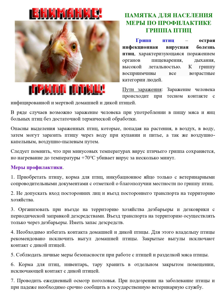 В целях недопущения распространения высокопатогенного гриппа птиц (далее – ВПГ) в крае просим принять меры по недопущению распространения вируса гриппа птиц на территории Соликамского городского округа в соответствии с Ветеринарными правилами осуществления профилактических, диагностических, ограничительных и иных мероприятий (памятка прилагается).