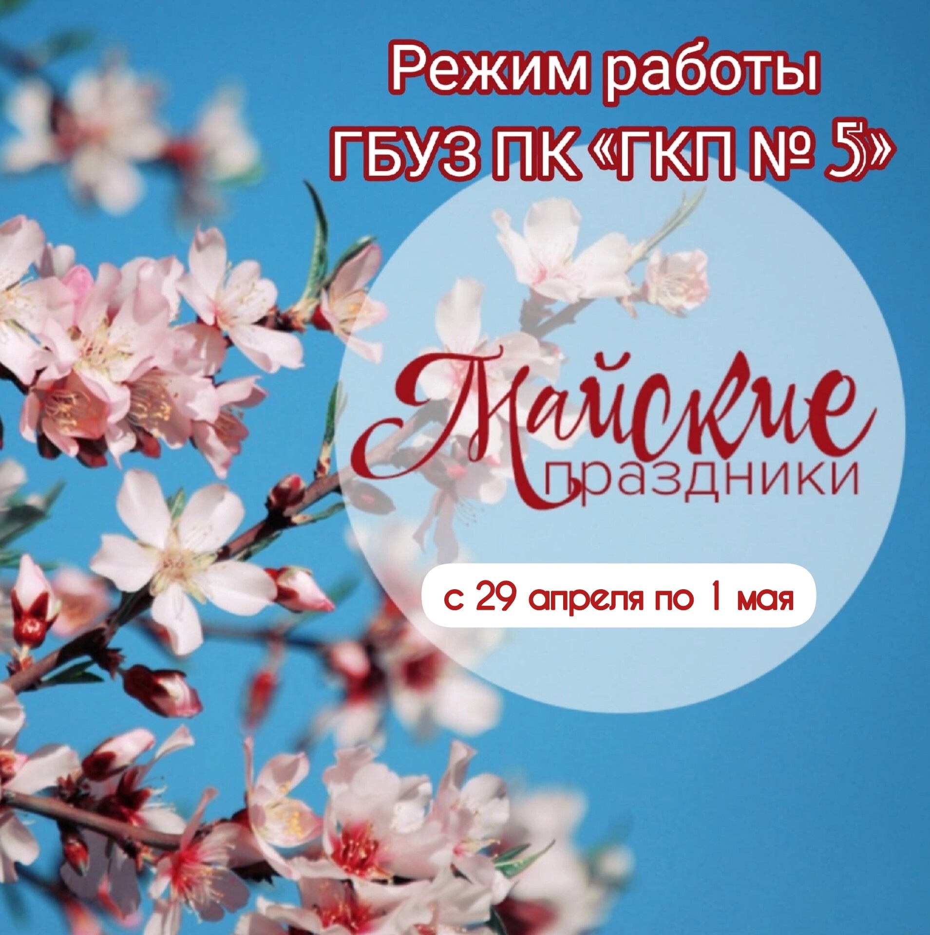 Обращаем Ваше внимание на режим работы ГБУЗ ПК «ГКП № 5» в предпраздничные и праздничные дни с 29 апреля по 1 мая 2023 года.